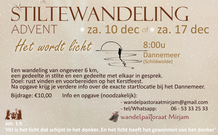 We wandelen door het prachtige landgoed De Braak. Je wordt uitgenodigd stil te staan bij de dingen waar je op hoopt, waar je verdrietig over bent of waar je naar verlangt, wat écht belangrijk is. Je krijgt onderweg teksten en vragen aangereikt die hierin richting geven.